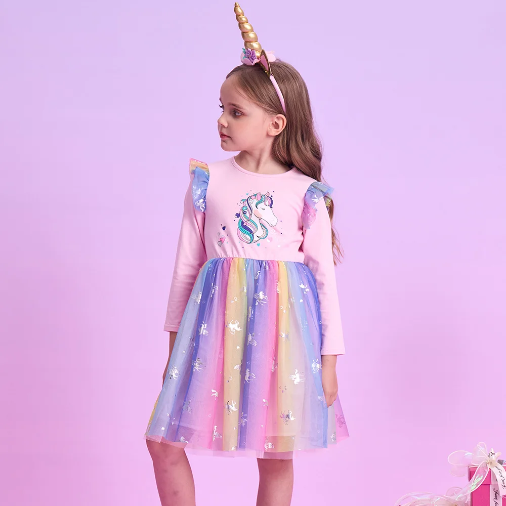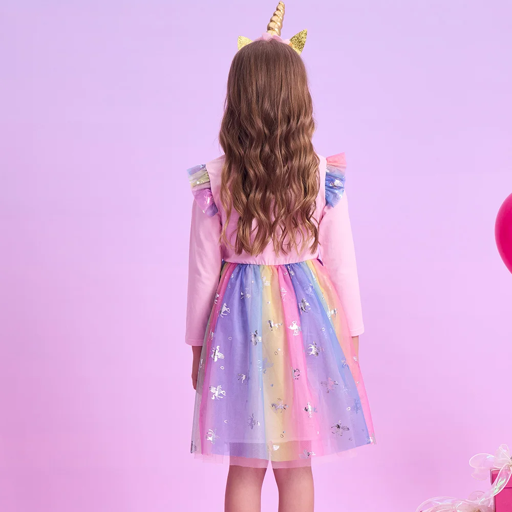 Girls' Long Sleeve Unicorn Dress – Autumn Mesh Tulle Princess Outfit for 4–8 Year Old